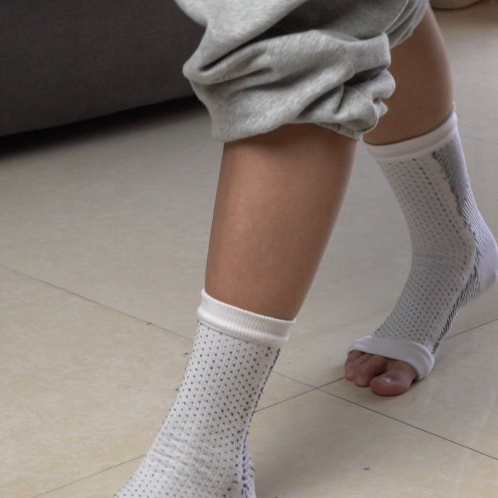 Kompressionsstrümpfe bieten zwar nicht die gleiche Unterstützung für die Faszien wie maßgefertigte Orthesen beim Stehen oder Gehen, aber sie haben die einzigartige Fähigkeit, die durch Plantarfasziitis verursachten Schmerzen zu lindern, während Sie nicht auf den Beinen sind. Auch wenn Sie nicht stehen, stützt die Socke Ihren Fuß mit leichtem Druck über das Fußgewölbe und die Fußsohlen. Diese Unterstützung trägt dazu bei, die Dehnung der Plantarfaszie aufrechtzuerhalten, während gleichzeitig die Durchblutung verbessert und Schwellungen gelindert werden, was die Schmerzen reduziert.